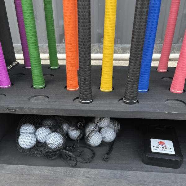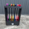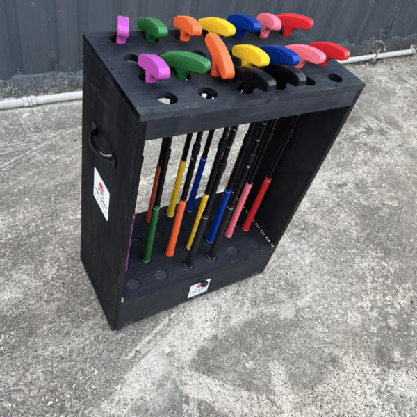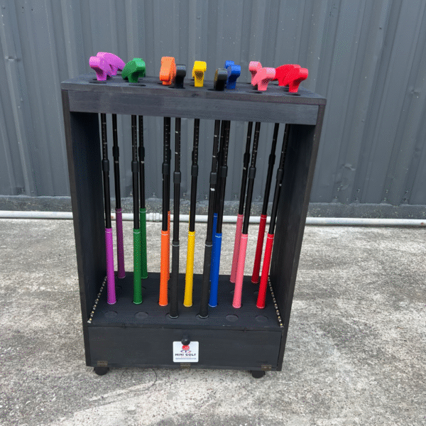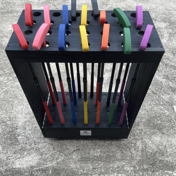 The MGG 27-Hole Wooden Putter Rollable Stand with Golf Ball Storage is a versatile and durable solution for organizing mini golf equipment. Constructed from premium solid wood, it features 27 putter slots and a built-in compartment for golf balls, keeping your equipment organized and easily accessible.
