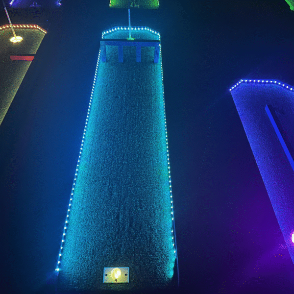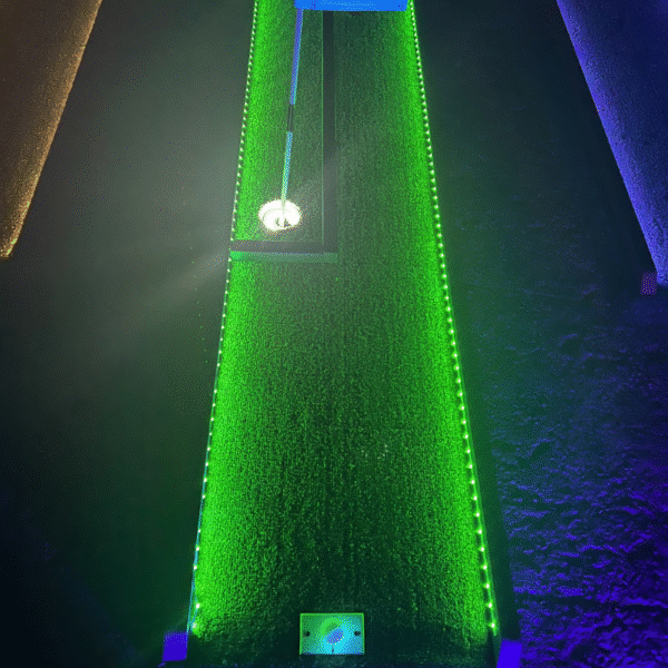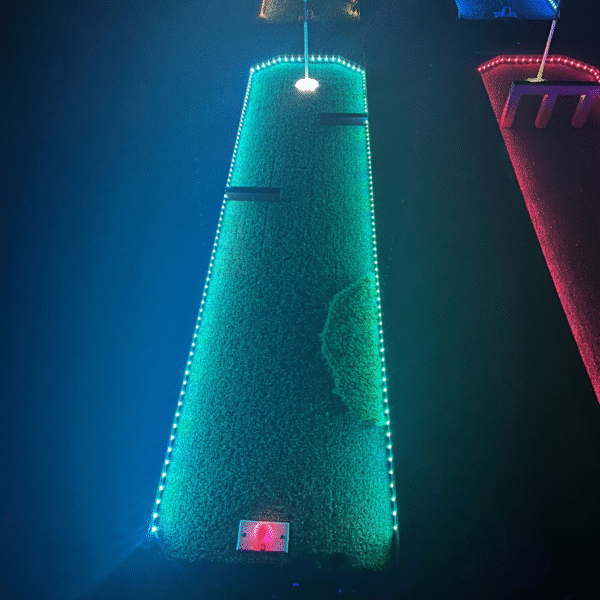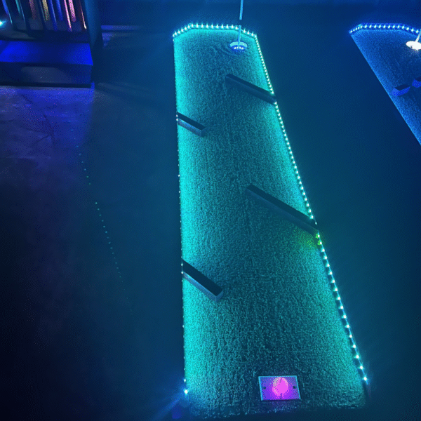Each hole is constructed from premium treated wood and sealed with Thompson Seal and Woodlife Black Wood Preservative for reliable indoor and outdoor performance. LED lighting runs along the course and inside each hole, powered by a 12V / 5V lithium battery system with several hours of runtime. Individual push-button on/off controls at each hole allow quick and easy operation. Fluorescent flag holes complete the glow experience.
